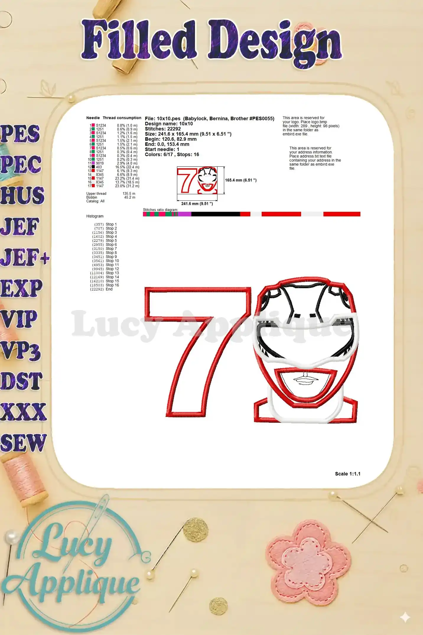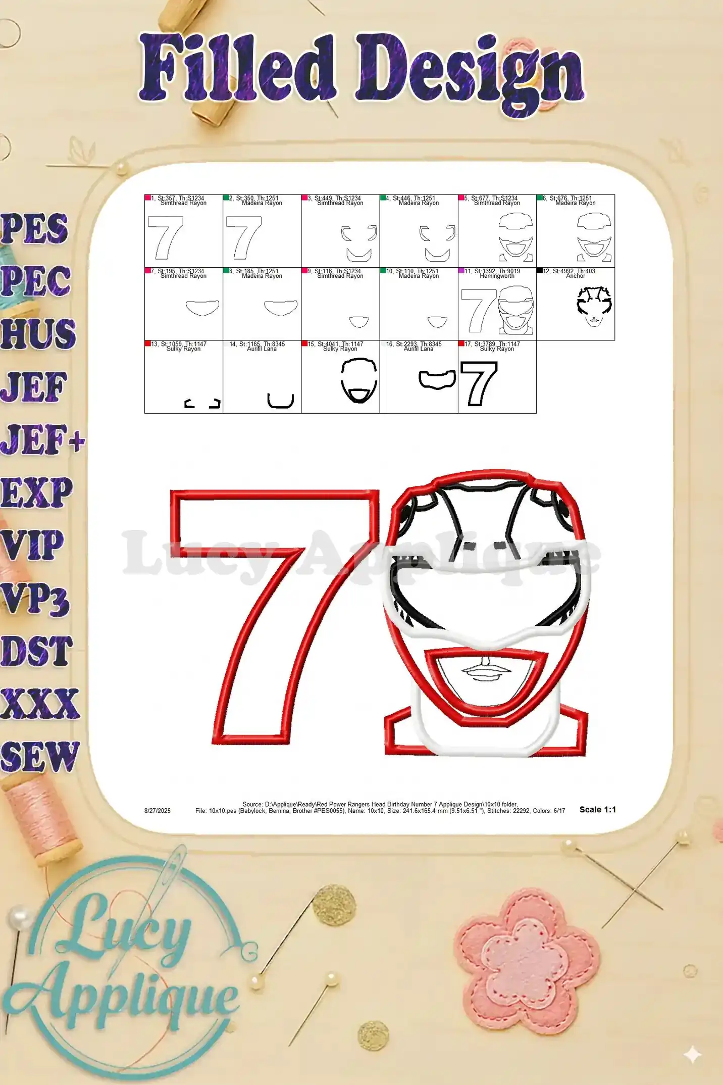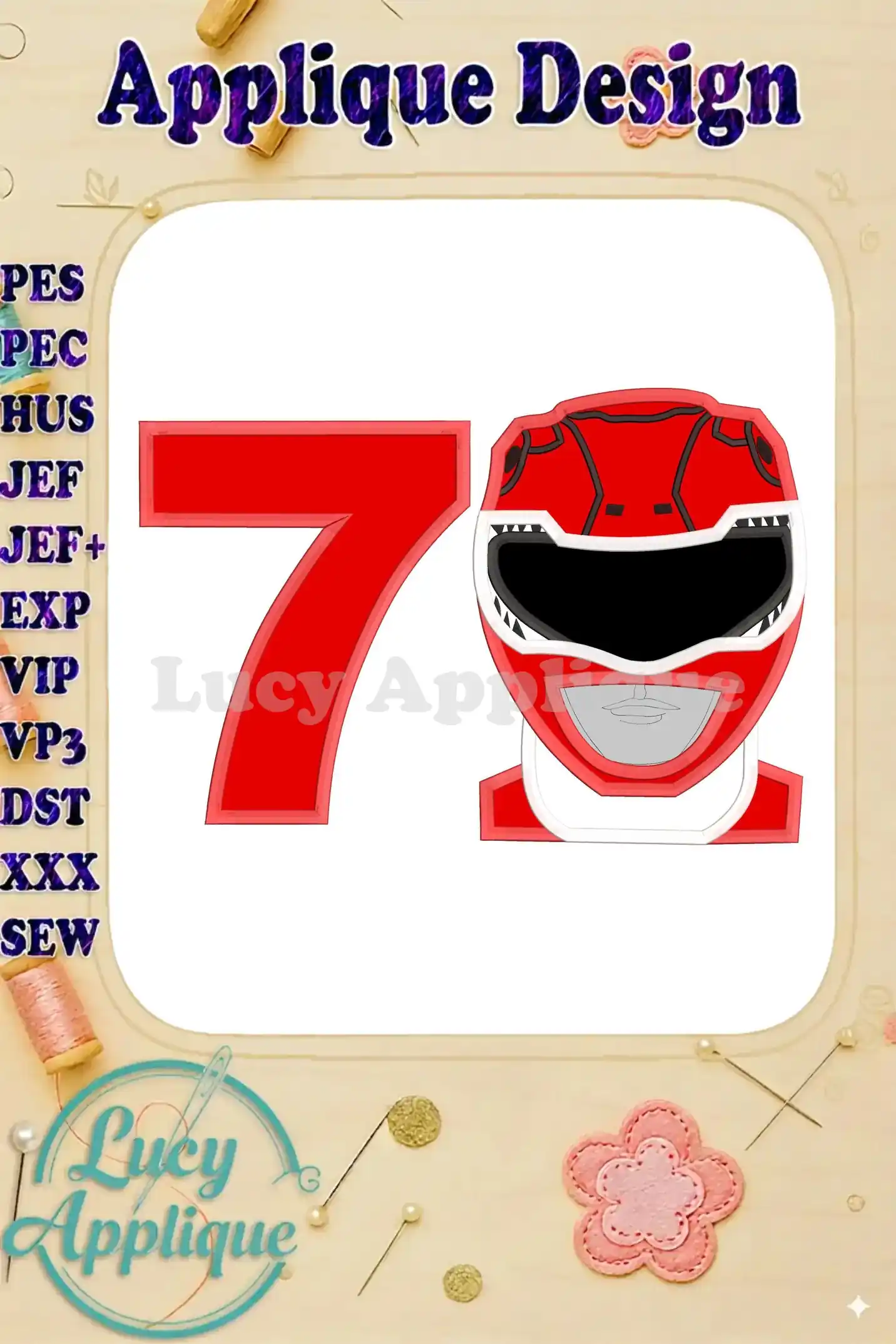 Red Power Rangers Head Birthday Number 7 Applique Design – Instant Download
