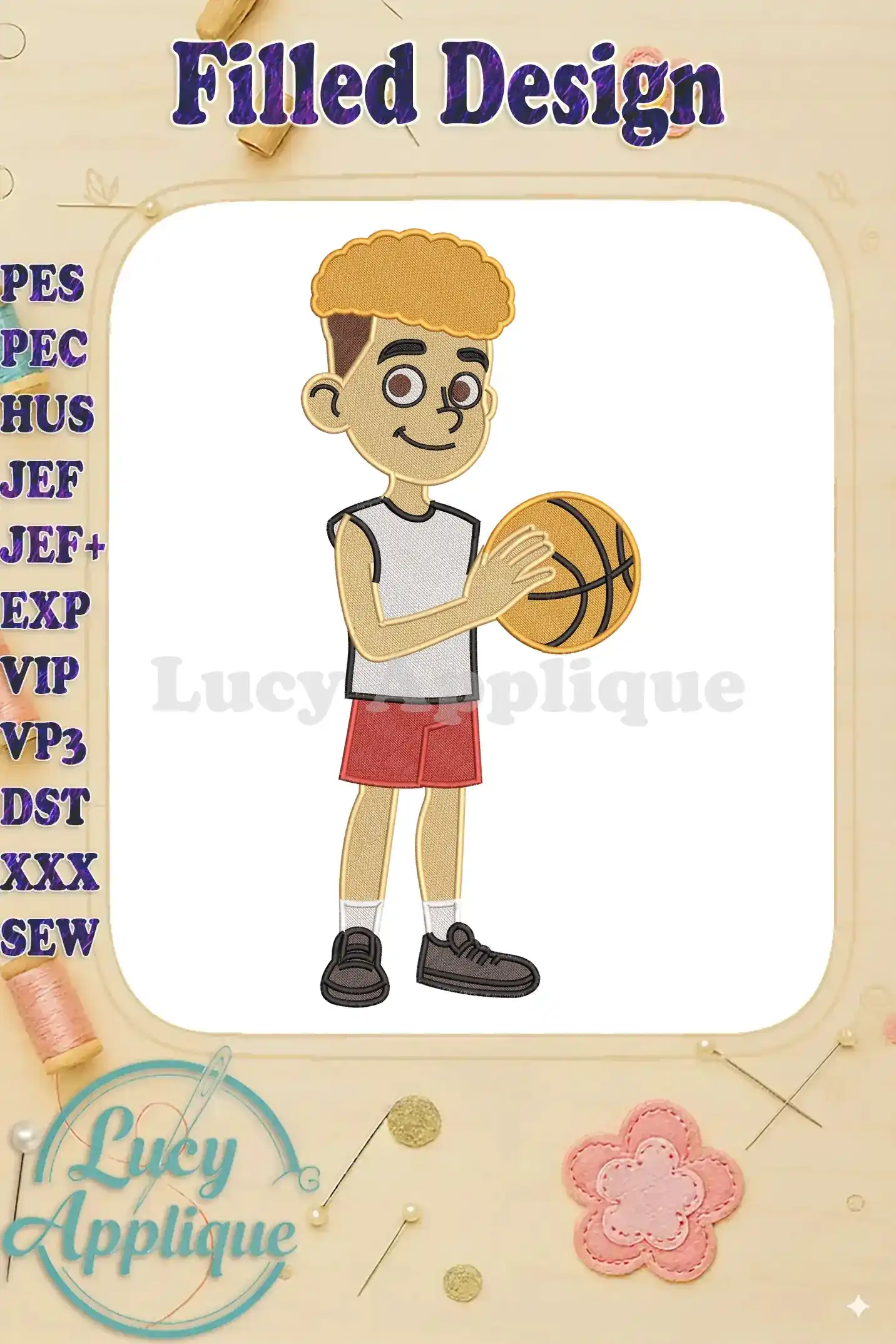 Sneaks character young boy playing basketball fill embroidery designs