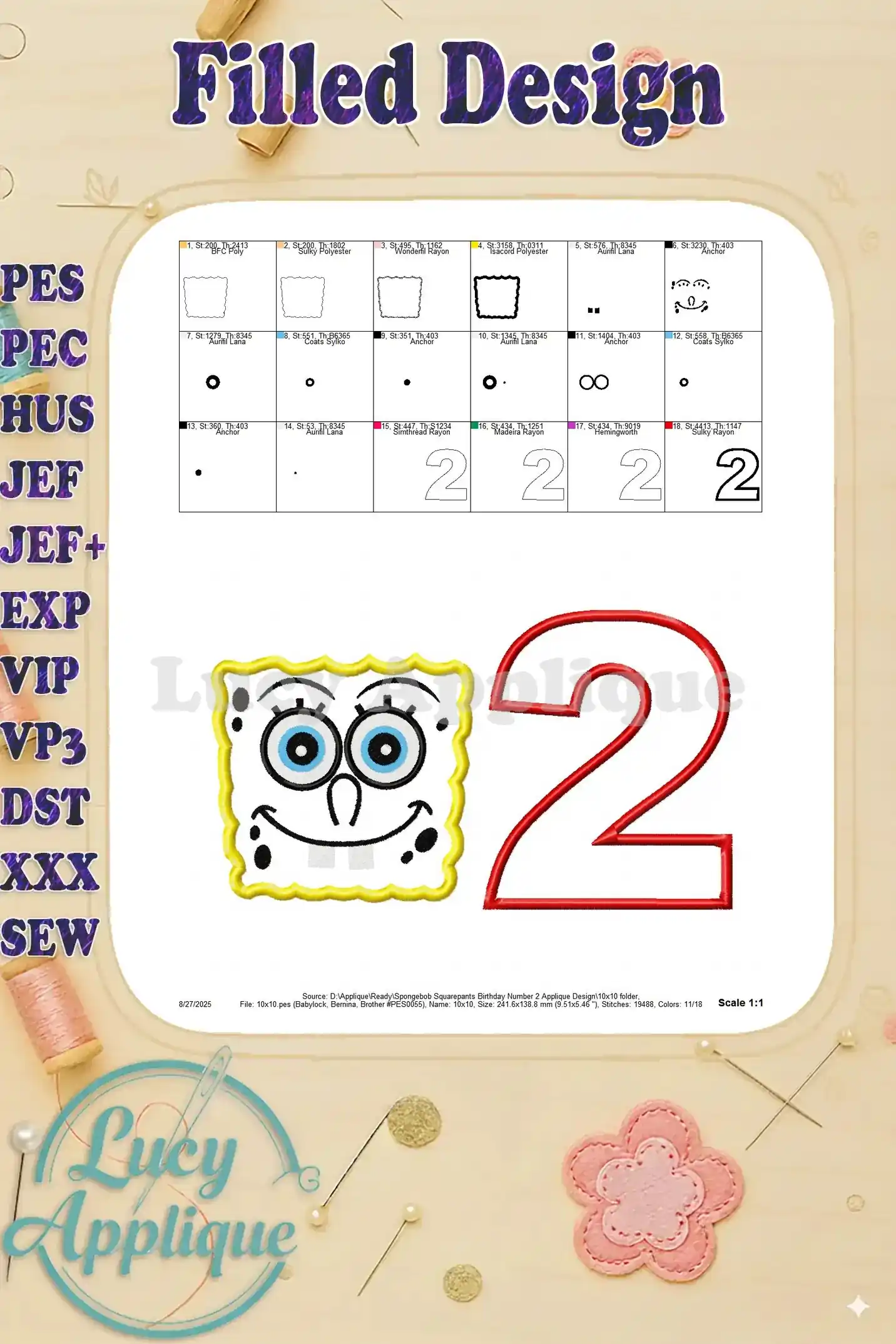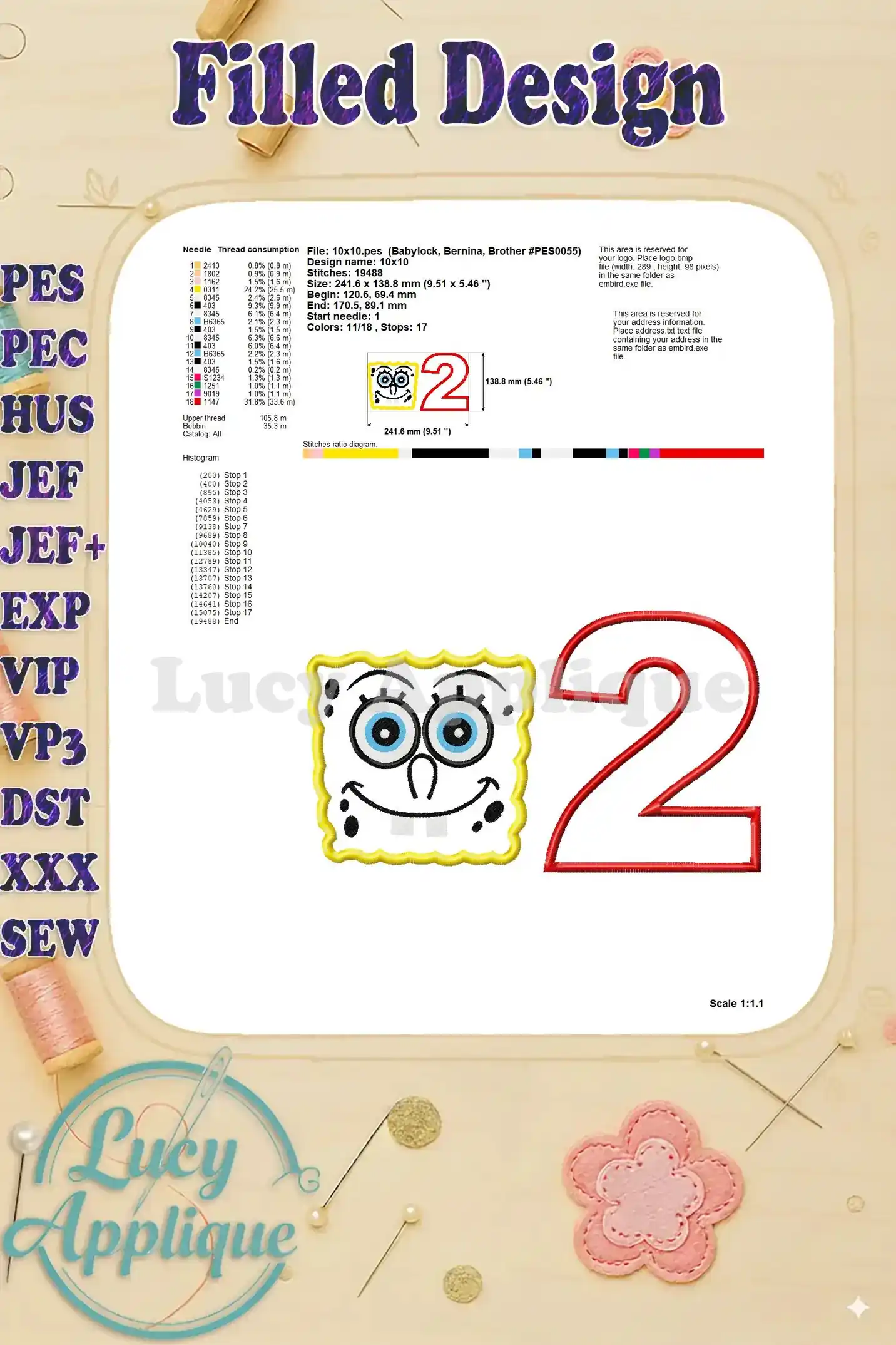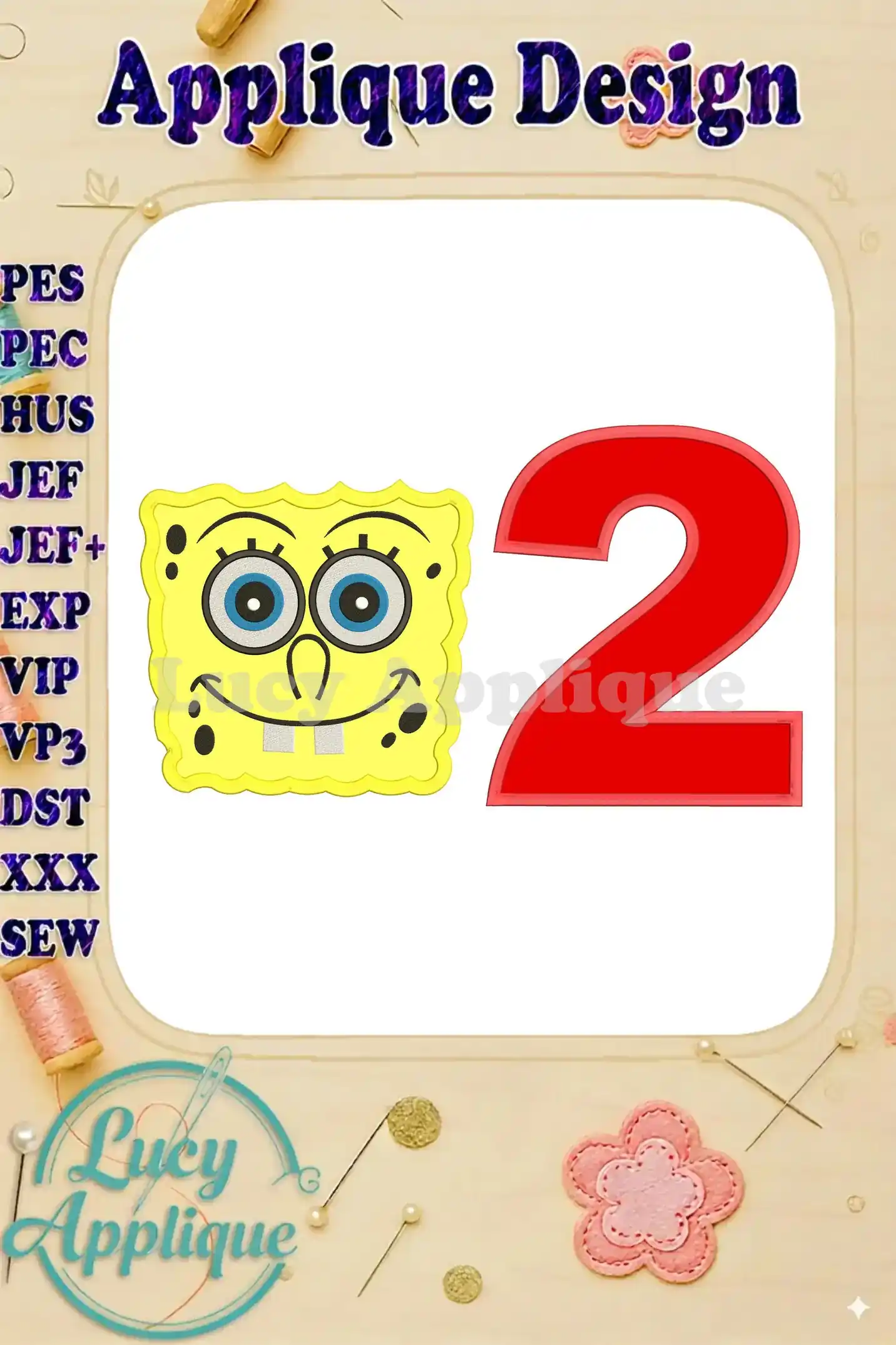 Spongebob Squarepants Birthday Number 2 Applique Design - Instant Download Spongebob Squarepants Birthday Number 2 Applique Design – Instant Download