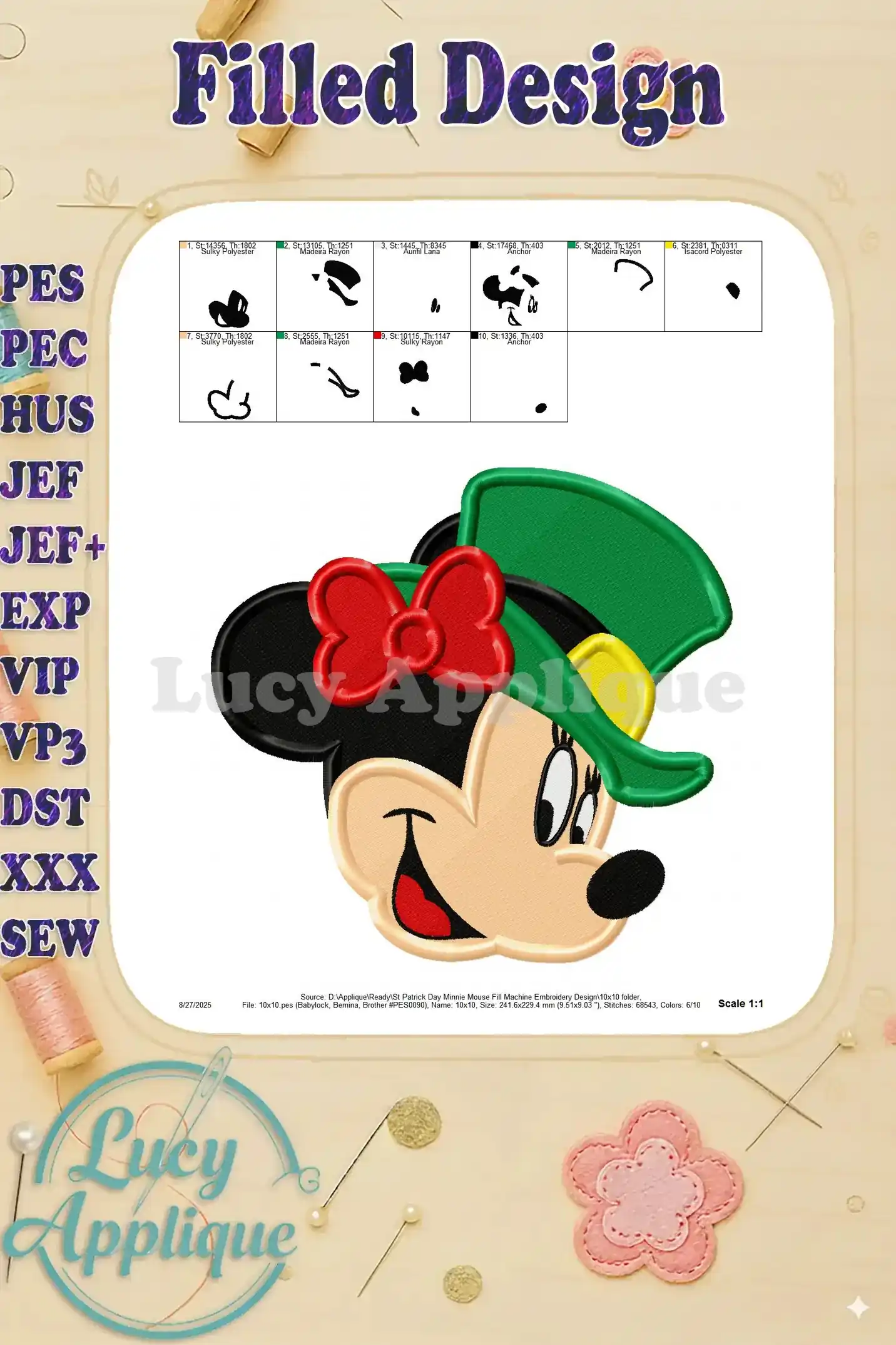St Patrick Day Minnie Mouse Fill Machine Embroidery Design – Instant Download