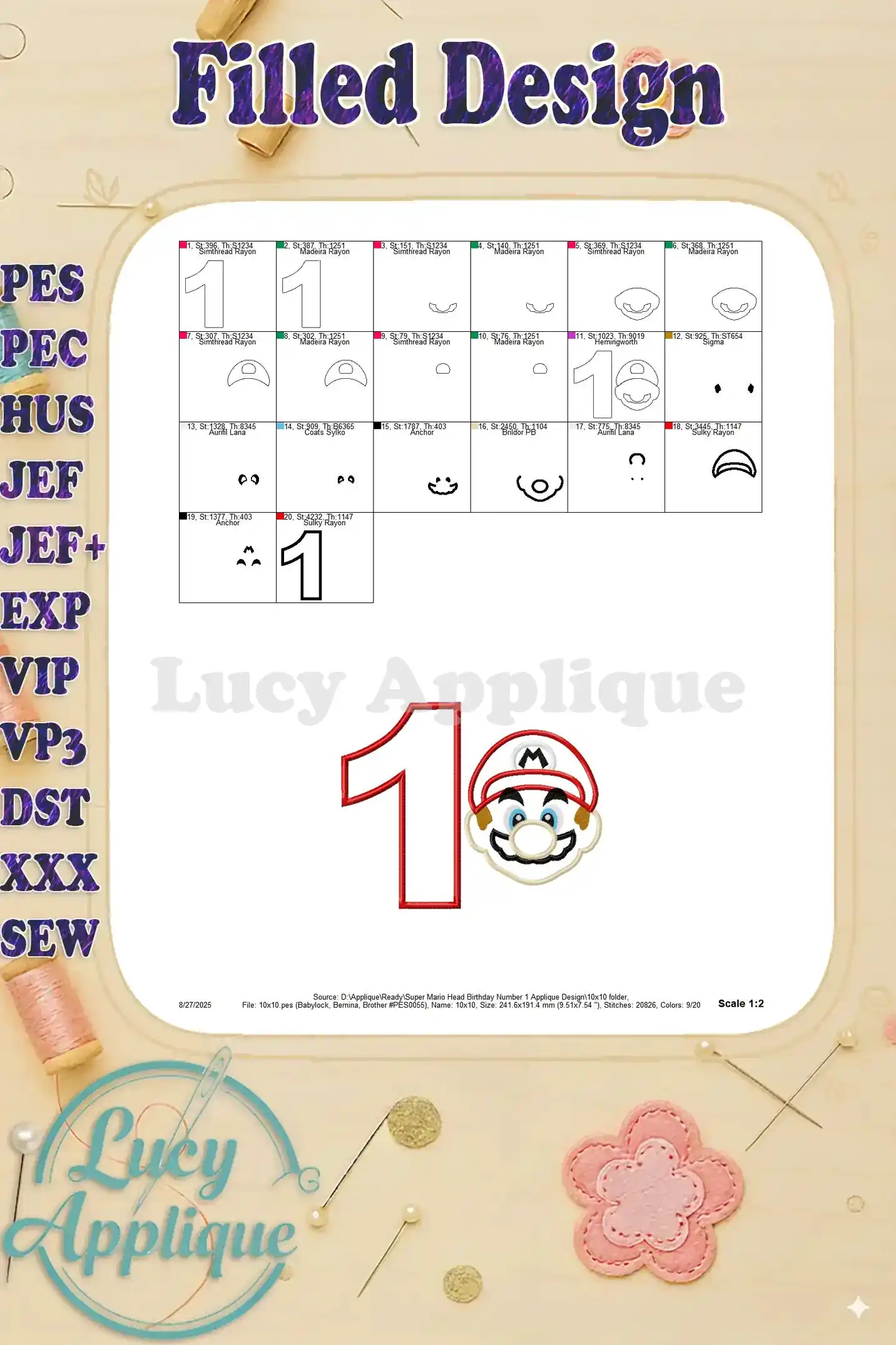 Super Mario Head Birthday Number 1 Applique Design – Instant Download