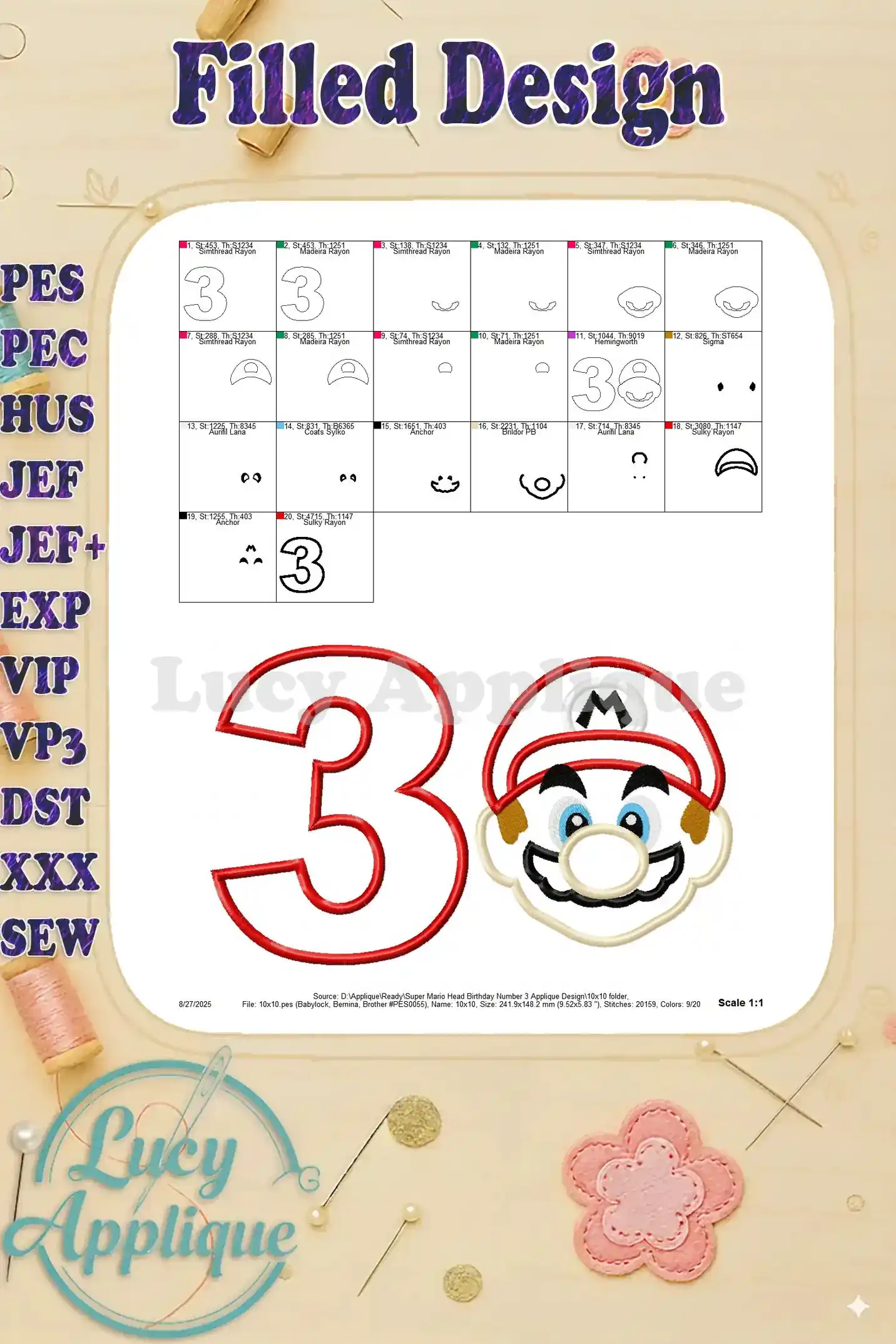 Super Mario Head Birthday Number 3 Applique Design – Instant Download