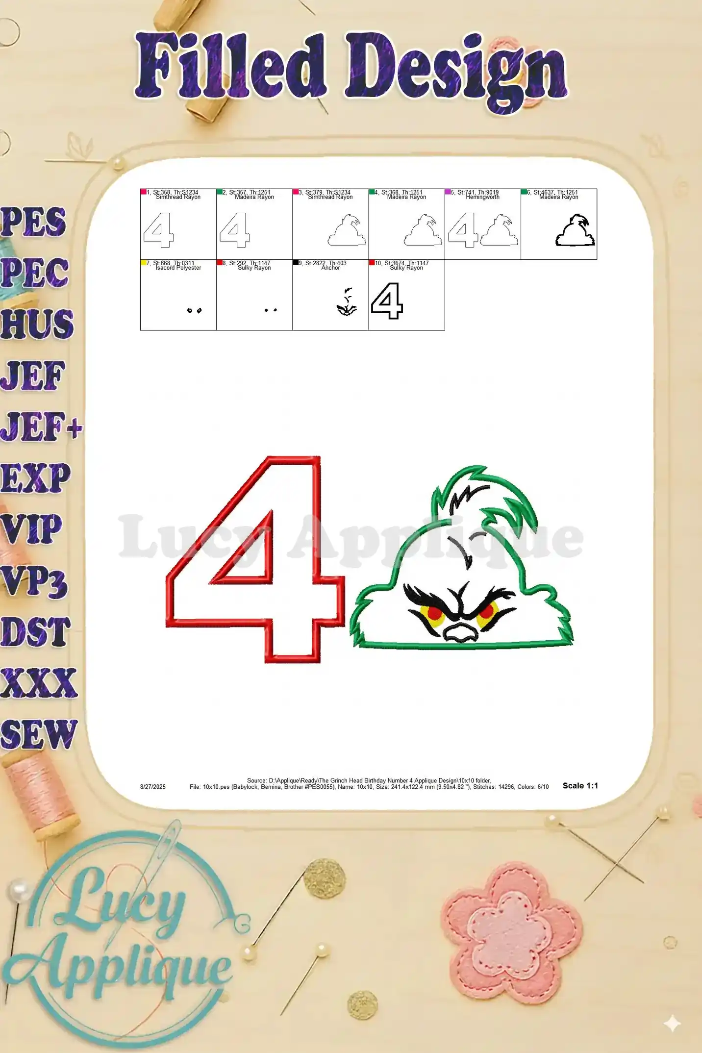 The Grinch Head Birthday Number 4 Applique Design – Instant Download
