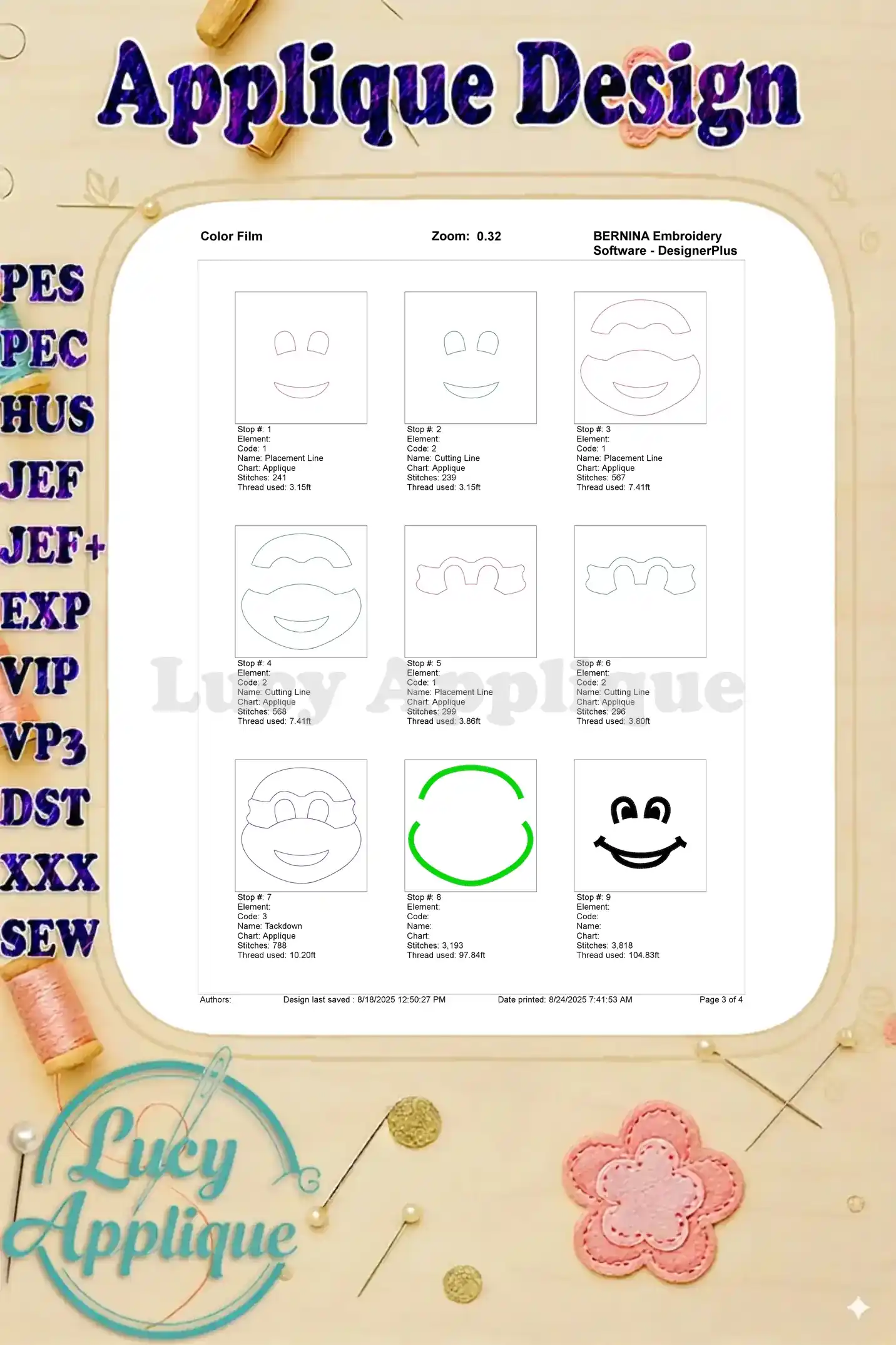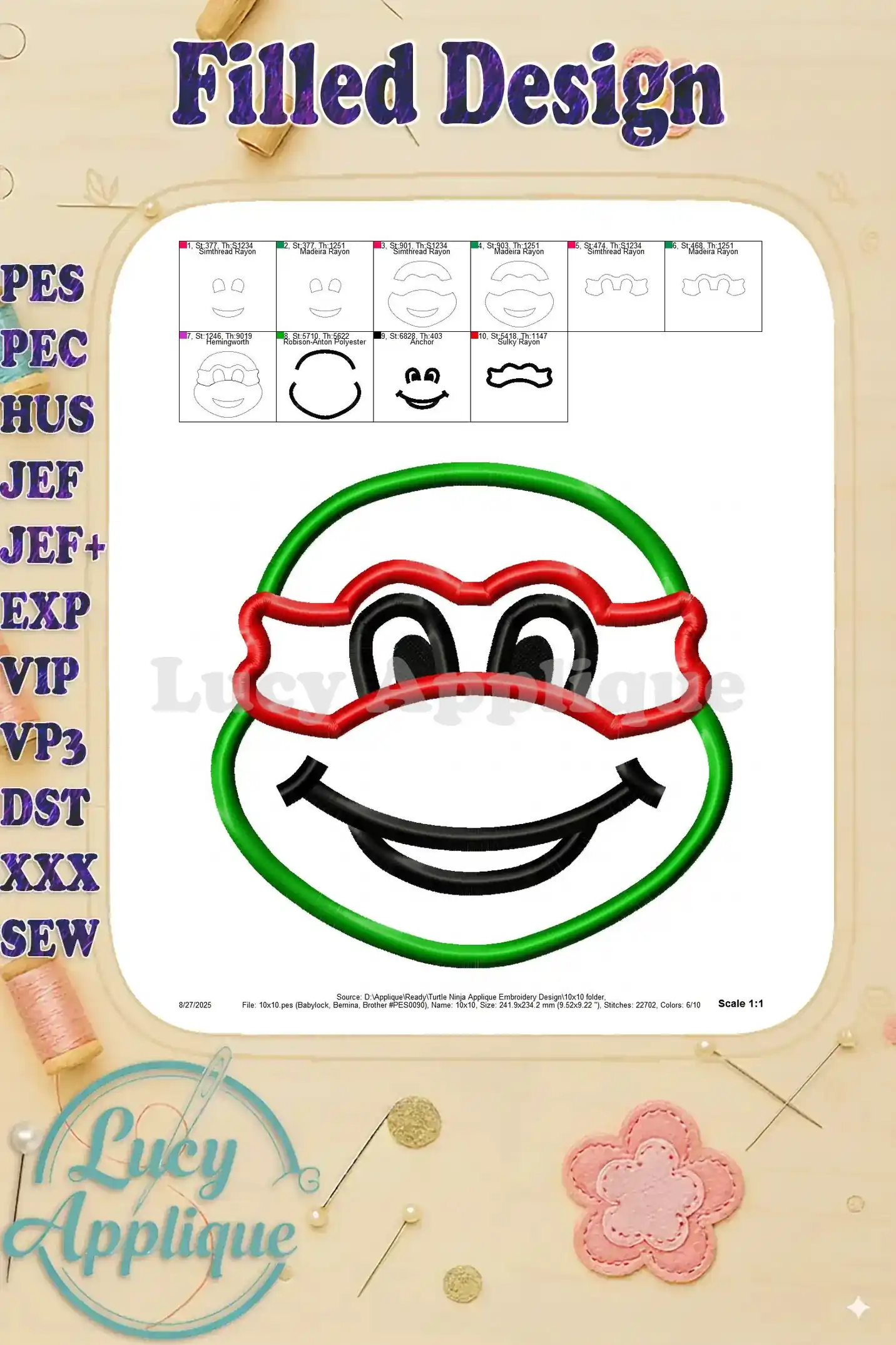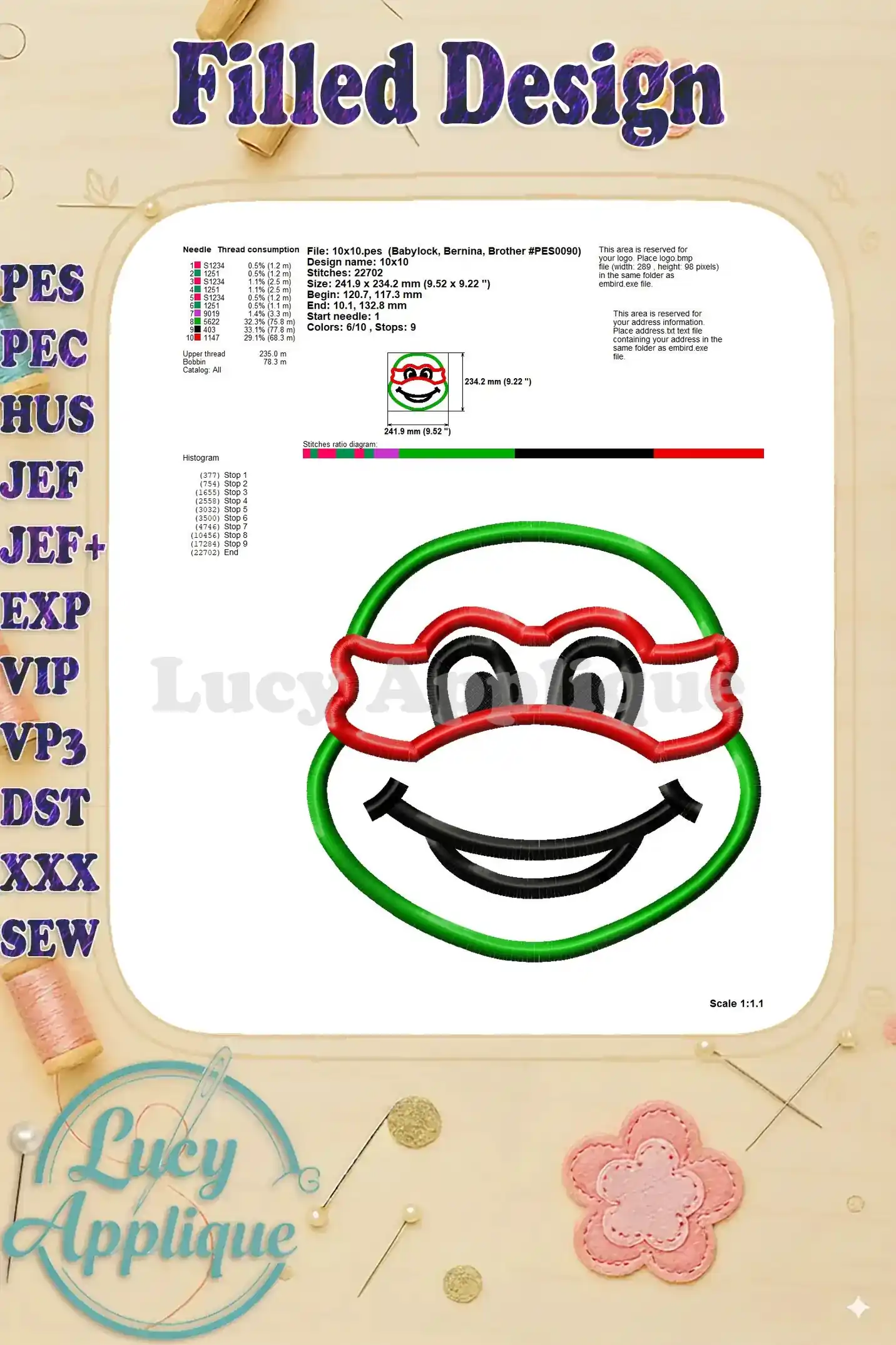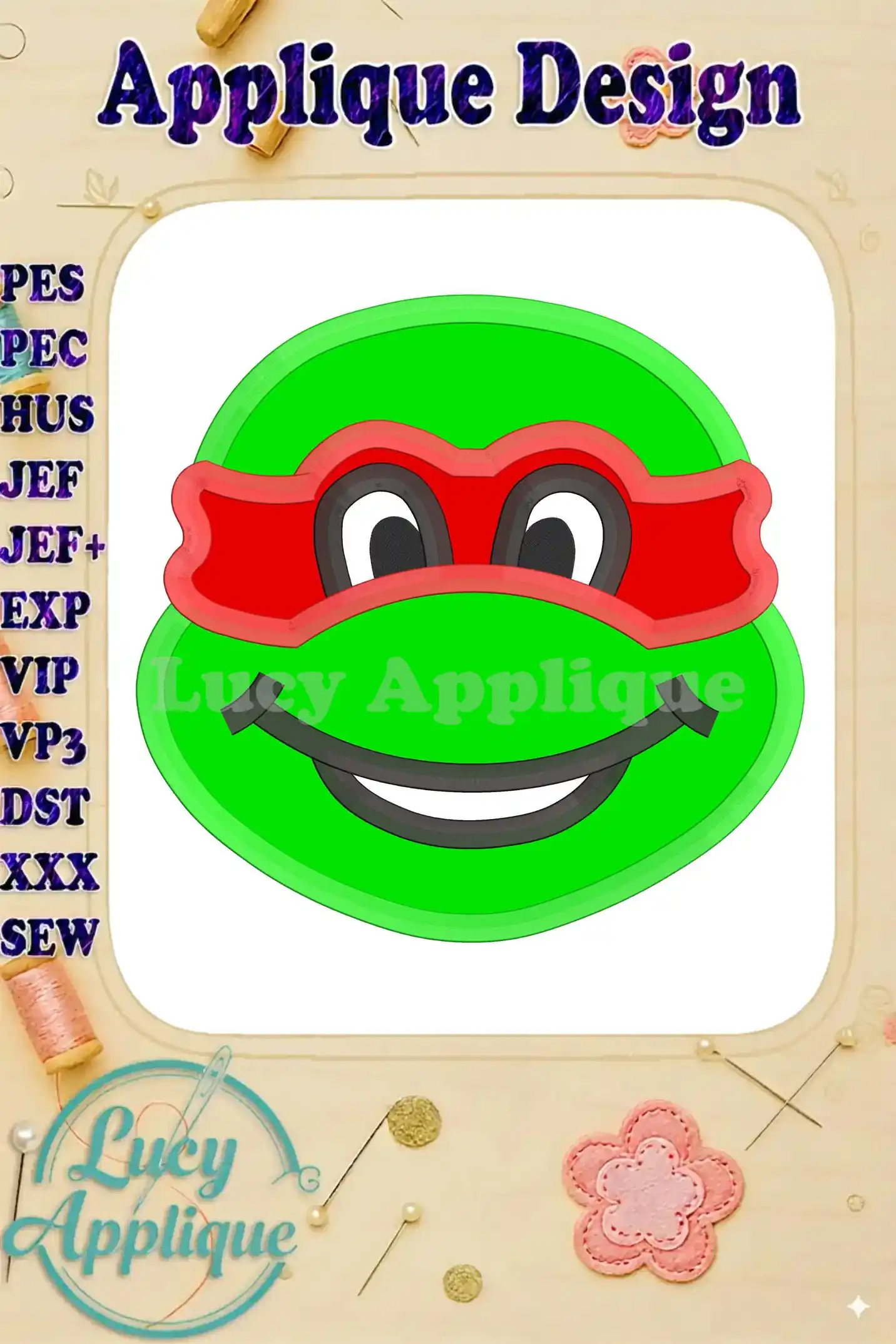 Adorable applique embroidery design of a Teenage Mutant Ninja Turtle! Perfect for kids’ clothes, bags, or home decor. Easy-to-follow instructions included. Makes a great gift!