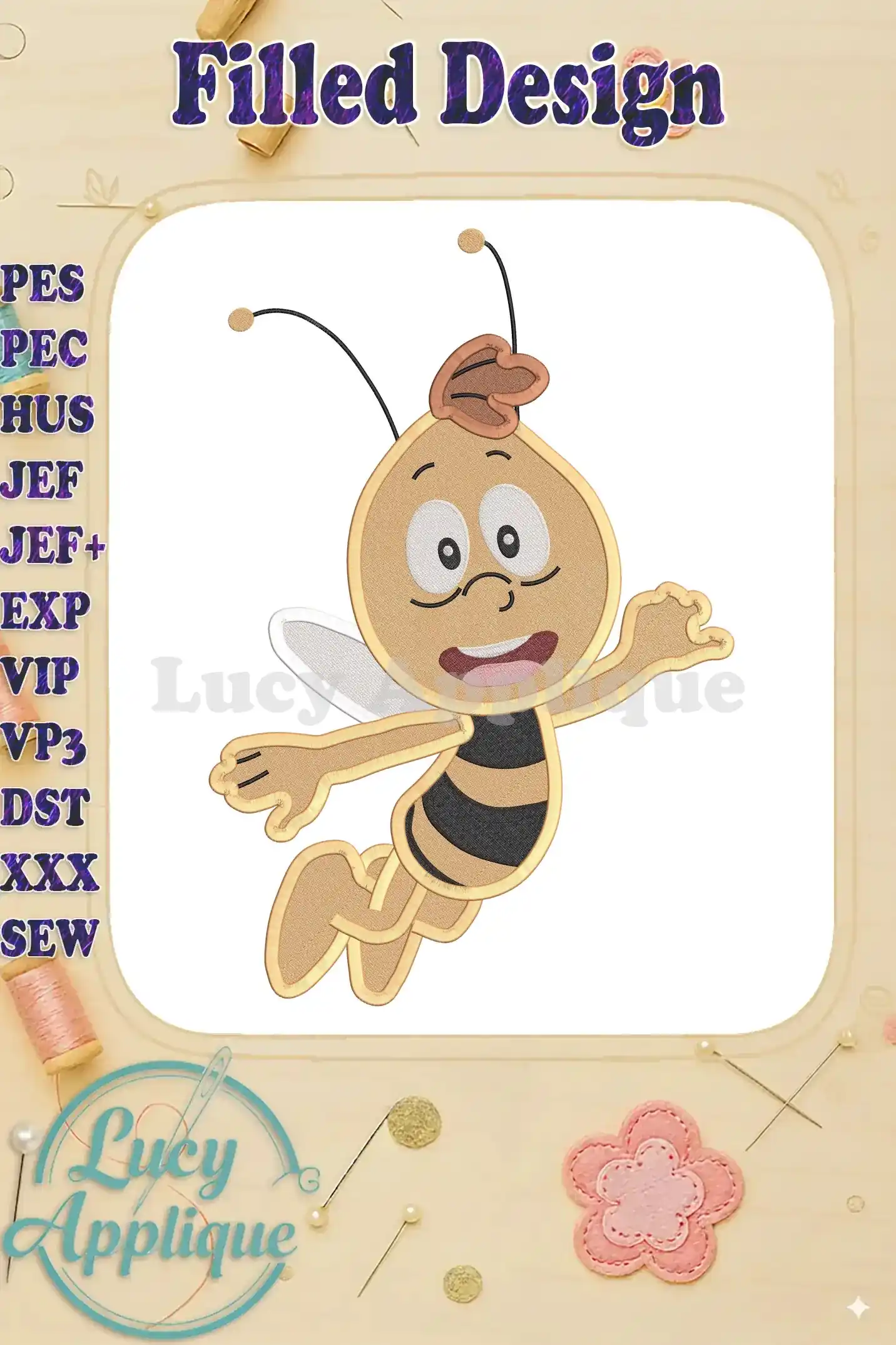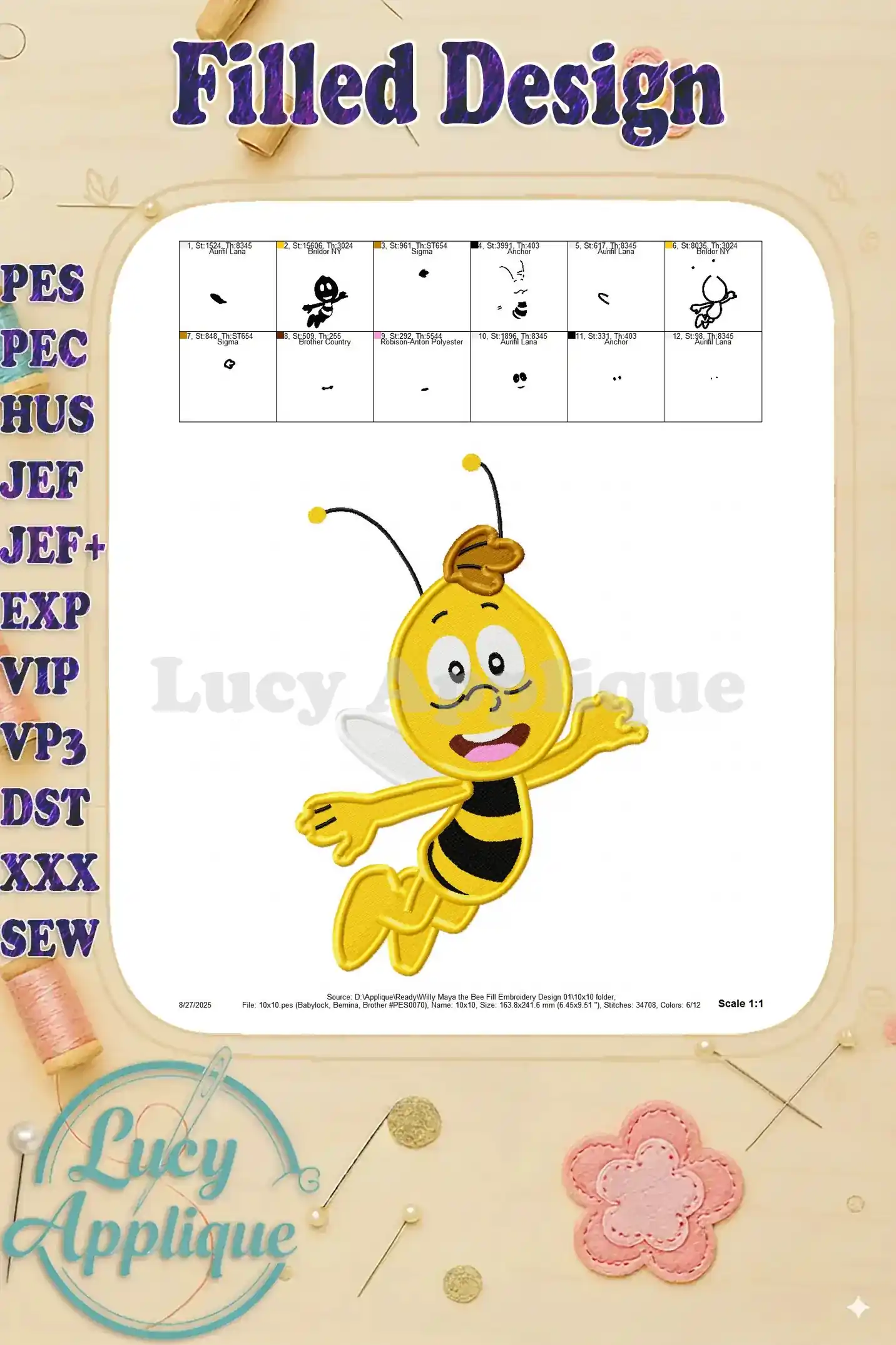 Adorable Willy Maya the Bee filled embroidery design! Perfect for adding a touch of whimsical charm to your projects. High-quality design, various formats included.