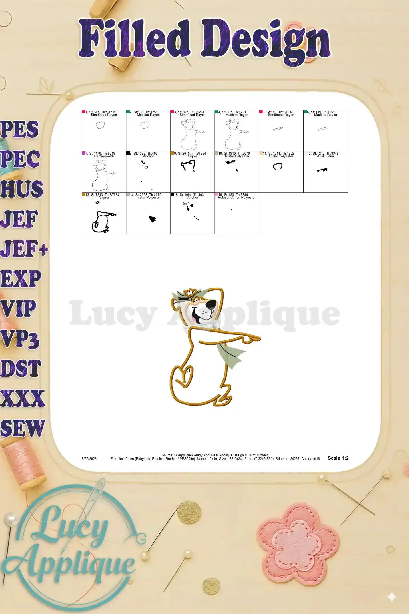 Adorable Yogi Bear applique embroidery design! Perfect for adding a fun, cartoonish touch to your projects. Download includes multiple formats for various embroidery machines.