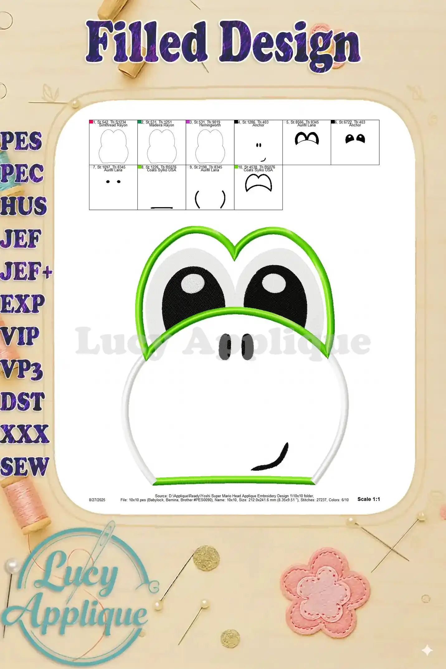 Yoshi Super Mario Head Applique Embroidery Design 1 – Instant Download